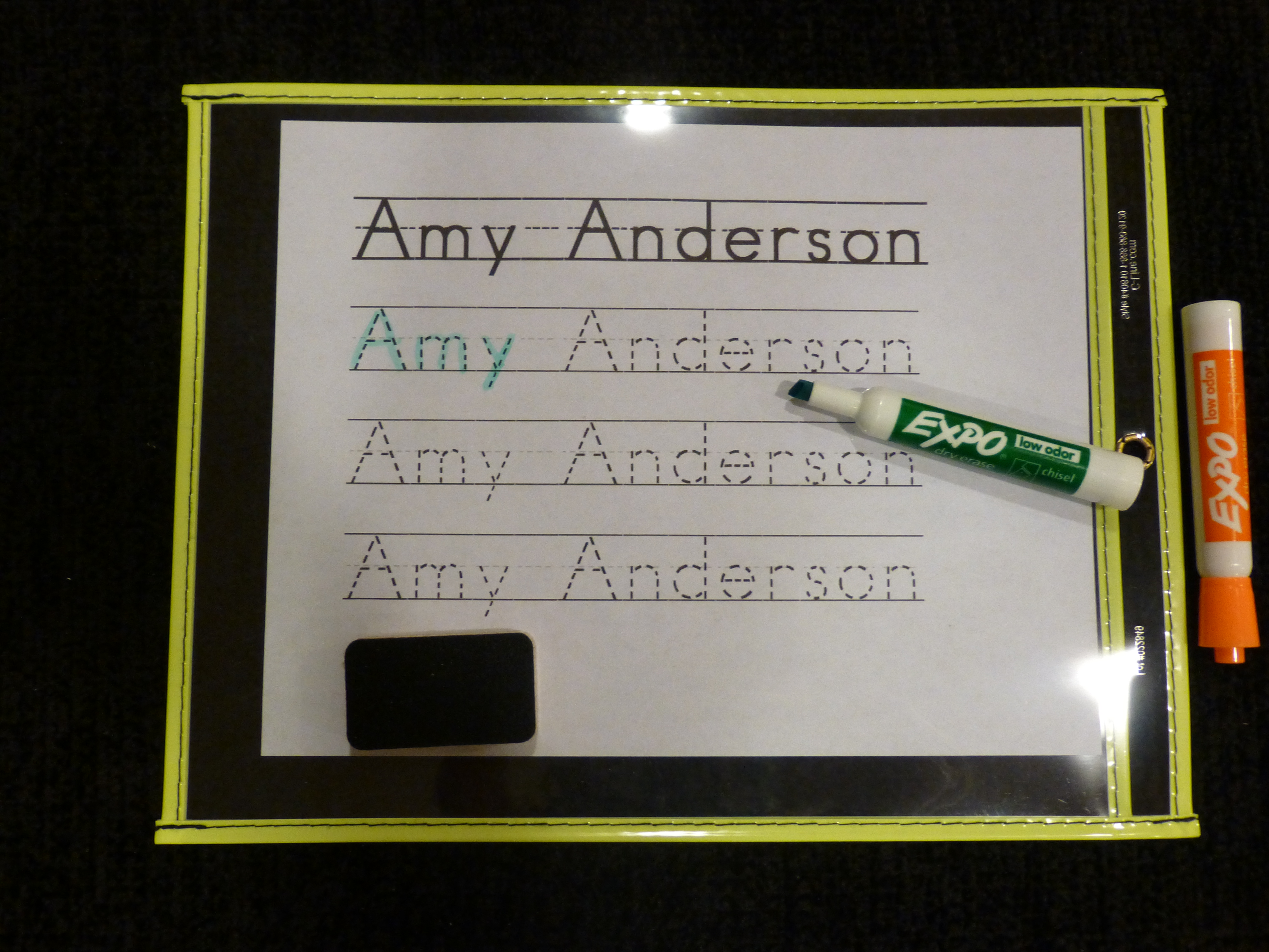 Write and wipe pouch, 2 dry erase markers and eraser used with prewriting practice sheets and personalized name writing practice sheets.
